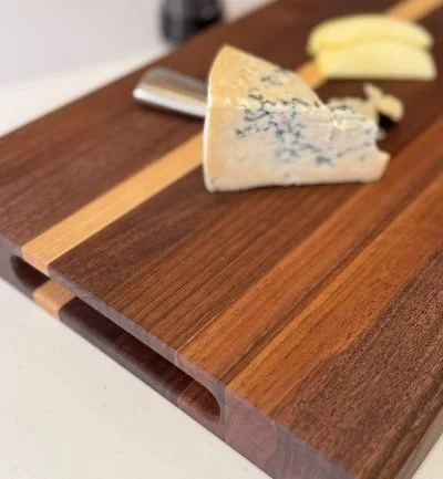 This Walnut, Maple and Padauk board is a heavy (about six pounds!) , inch-and-a-half thick board, with perfectly sculpted hand holds crafted into the sides for a sure grip during your meal’s preparation. (Although attractive enough for display as a table centerpiece, as well.)